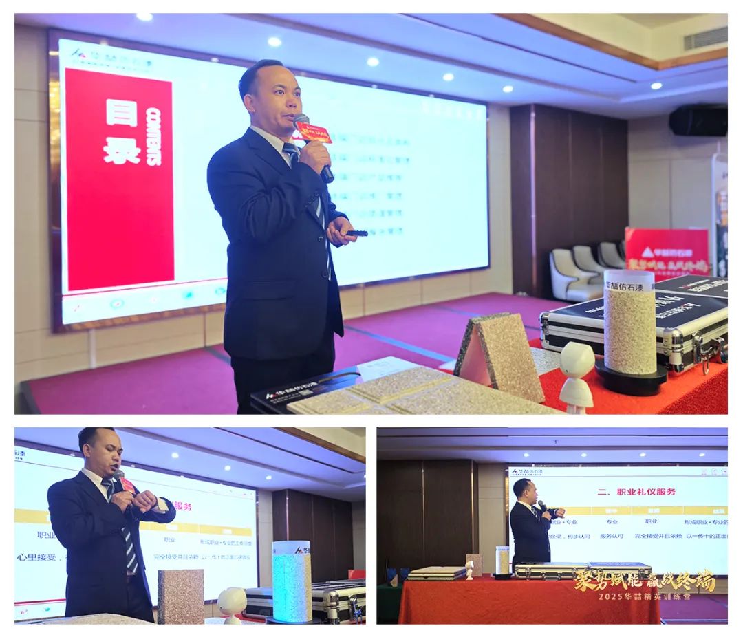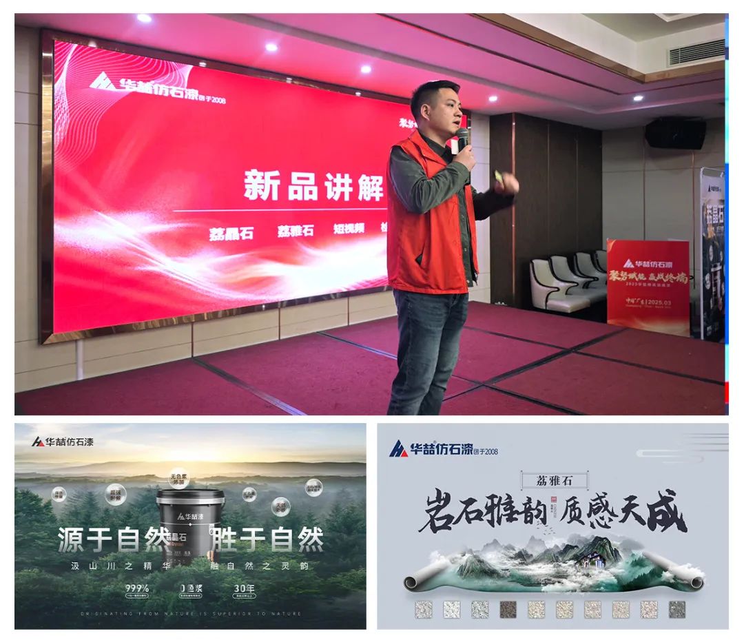 隨后由華喆技術(shù)應(yīng)用--劉工,現(xiàn)場發(fā)布了華喆2025年度外墻新品系列的內(nèi)容,為現(xiàn)場經(jīng)銷商伙伴們講解新品的賣點(diǎn)及銷售分享。深入淺出地介紹了新品的卓越性能和多樣化應(yīng)用,并通過生動的營銷道具應(yīng)用展示,讓經(jīng)銷商們直觀感受到了華喆仿石漆產(chǎn)品的獨(dú)特魅力和市場競爭力。