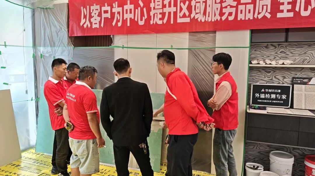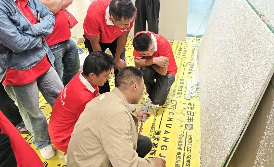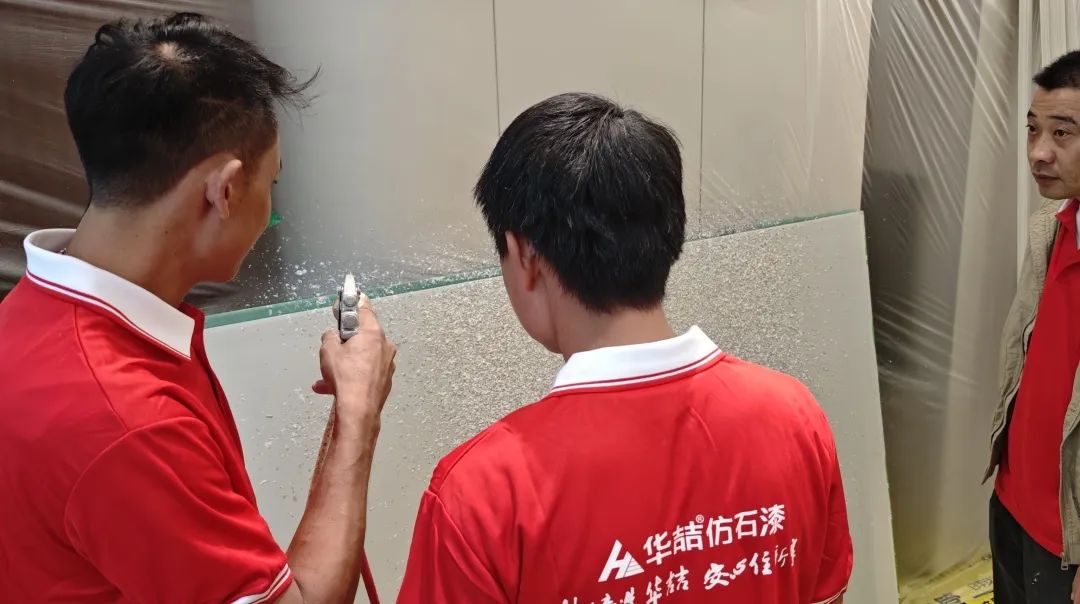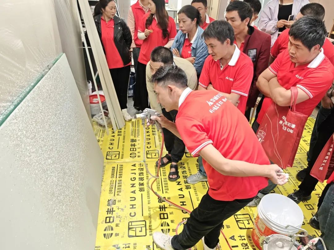 現(xiàn)場(chǎng)施工實(shí)操環(huán)節(jié),在華喆技術(shù)人員的指導(dǎo)下,油木工們親自上手,體驗(yàn)了仿石漆的實(shí)際施工過(guò)程。他們認(rèn)真操作,仔細(xì)琢磨,不僅加深了對(duì)施工工藝的理解,還提升了自身的實(shí)操能力?,F(xiàn)場(chǎng)氛圍熱烈而有序,每個(gè)人都沉浸在仿石漆的魅力之中。